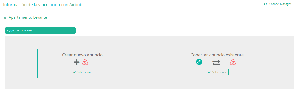 Aquí un ejemplo de cómo comenzar a crear nuevo anuncio o a conectar un anuncio ya existente en la plataforma Airbnb: